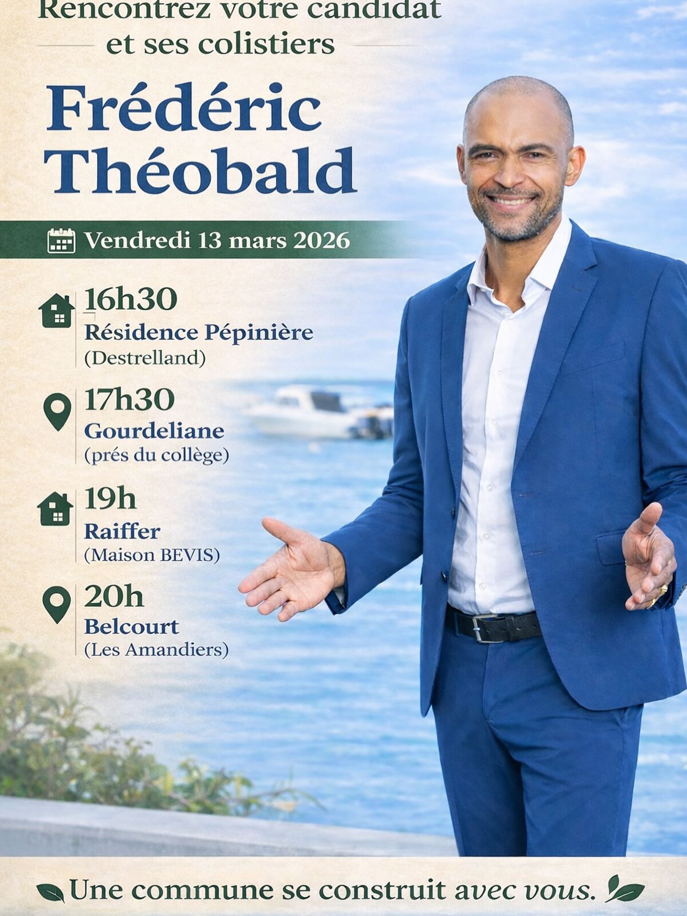 Baie-Mahault mérite une nouvelle dynamique alliant efficacité et proximité. Avec mon équipe, nous portons une candidature engagée afin de remettre vos besoins au centre de toutes les décisions municipales.